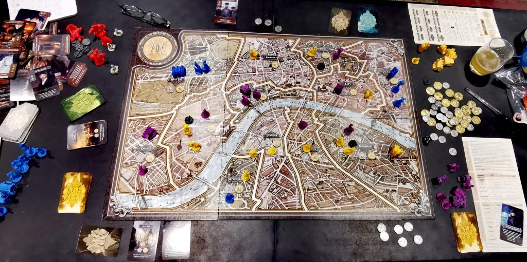 L’action se déroule sur un plateau qui représente la ville de Londres divisée en 12 quartiers. Chaque joueur dispose de partisans et de bâtiments qu’il peut placer sur le plateau en jouant des cartes. Les 132 cartes du jeu sont différentes et proposent beaucoup de personnages célèbres ou d’événements qui ont composée l’œuvre de C. Dickens ou d’A.C. Doyle. Les règles du jeu sont simples : à votre tour, vous jouez une carte et en appliquez les effets. La plupart des cartes proposent de réaliser plusieurs actions et vous pouvez choisir soit de les faire toutes ou non. Certaines cartes vous permettent également de jouer une deuxième carte, ce qui vous permet de faire des actions en chaîne, une des signatures de Martin Wallace.